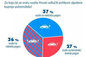 Na pitanje o tome za kakvo bi se vozilo odlučili kod sljedeće kupnje 73 posto Hrvata koji razmišljaju o nabavi automobila odgovara da bi to bilo ili hibridno ili električno vozilo. To je 46 posto postotnih bodova više od postotka onih koji navode da bi kupili vozilo na dizelski ili benzinski pogon (27 posto). Točnije, podjednak broj Hrvata odlučio bi se za vozilo na hibridni (36 posto) odnosno električni (37 posto) pogon.