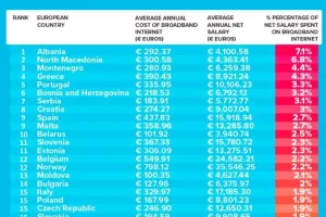Ovo istraživanje, koje je proveo SurfShark, donosi cijene pristupa internetu u 37 europskih zemalja i pokazuje tko najviše plaća pristup širokopojasnom internetu svake godine u odnosu na godišnji neto dohodak.