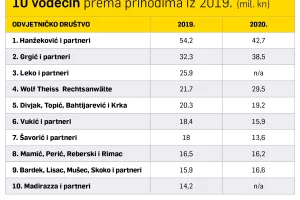S obzirom da nisu svi još predali svoja financijska izvješća, oslonit ćemo se na podatke iz 2019. i spomenuti lanjske koji su dostupni. Već godinama kao najveće odvjetničko društvo slovi ono Hanžekovića i partnera koji imaju najveći prihod. Tako su u 2019. ostvarili 54,2 milijuna kuna prihoda uz 12,2 milijuna kuna neto dobiti, dok su lani u vrijeme pandemije, kako su nam rekli, ukupni prihodi iznosili 42,7 milijuna kuna, a bruto dobit je bila 10,5 milijuna kuna (neto 8,7 milijuna prema Poslovnoj Hrvatskoj).