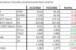 Eskalacija sukoba na granici Ukrajine i Rusije te opasnost od izbijanja (općeg) rata glavna je vijest već duže vrijeme u svijetu. Bezbrojne analize su već napravljene, svakakve (ne)provjerene informacije izmjenjuju se medijskim prostorom gotovo iz minute u minutu. Naravno da takva događanja imaju veliki utjecaj na tržišta, stoga ne treba čuditi da je volatilnost vrlo izražena, a da su gotovo sva tržišta na burzama u backwardationu (nazadovanju, situaciji u kojoj su cijene futuresa ugovora sa najbližim rokom dospijeća veća od onih s kasnijim rokom dospijeća – primjerice WTI crude oil ugovori MAR su skuplji od onih za APR, koji su pak skuplji od onih za MAY itd). Nakon što je u srijedu objavljena vijest o povlačenju ruskih vojnika te kada se nije dogodio napad u tu srijedu za koju su danima prije mnogi mediji najavljivali početak napada, tržišta su 'odahnula' što su mnogi investitori iskoristili priliku za uzimanje profita, što je dovelo do pada cijena. Međutim, sve se to do kraja tjedna preokrenulo nakon što su nastavljeni medijski napisi o nastavku tenzija na tom području i ponovnom zaoštravanju odnosa.