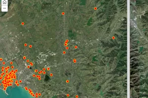 U trećoj aplikaciji može se uspoređivati stanje i prije i poslije potresa (korištenjem gore spomenute satelitske snimke) te kroz identifikaciju crvenih točki vidjeti oštećenja na zgradama kako su ih građani unijeli u prije spomenutoj 'crowdsourcing' aplikaciji.