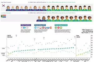 Stanovništvo postaje starije u svim zemljama OECD-a, ali postoje jasne razlike u brzini starenja. Na primjer, Japan drži titulu najstarijeg stanovništva, s jednom trećinom građana starijih od 65 godina. Očekuje se da će do 2030. godine radna snaga u toj zemlji pasti za 8 milijuna - što će dovesti do velikog potencijalnog nedostatka radne snage. Njihov susjed Južna Koreja trenutno se hvali s najmlađom populacijom, tj, mlađom od prosječne, no i ona će brzo ostarjeti te će se dogoditi da Južna Koreja ima najveći omjer između starih i mladih među razvijenim zemljama.
