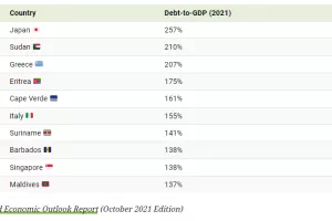 Prema podacima MMF-a Japan, Sudan i Grčka su na vrhu liste s omjerom duga prema BDP-u znatno iznad 200 posto, a slijede Eritreja (175 posto), Zelenortski otoci (160 posto) i Italija (154 posto).