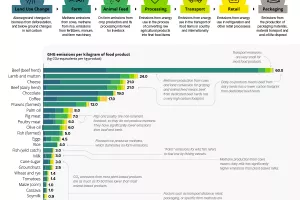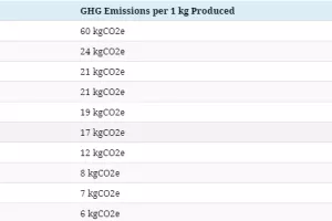 U svijetu se godišnje oko 13,7 milijardi metričkih tona ekvivalenta ugljičnog dioksida (CO2e) emitira kroz lanac opskrbe hranom. Kroz bazu podataka koja se prostire na 119 zemalja i 38.000 gospodarstava, studija je utvrdila da govedina i drugi životinjski proizvodi imaju ogroman učinak na emisije stakleničkih plinova. Na primjer, jedan kilogram govedine rezultira sa 60 kilograma stakleničkih plinova što je gotovo 2,5 puta više od sljedeće najbliže hrane, a to je janjetina i ovčetina. Suprotno tome, ista težina jabuka proizvodi manje od jednog kilograma stakleničkih plinova.