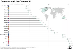 Na vrhu liste 'najčišćih' nalazi se Novi Zeland. I, kao što vidite, kvaliteta zraka obično je najviša u naprednim obalnim gospodarstvima s niskom gustoćom naseljenosti, a pomaže i to što je zemlja otok ili što graniči s manje nastanjivom arktičkom tundrom.
