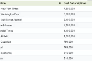Vladar pretplata s njih čak 7,5 milijuna je The New York Times koji zauzima prvo mjesto na ovoj listi. Posebno uspješna bila je pandemijska 2020. godina u kojoj je The New York Times u prvom tromjesečju ostvario isti iznos od digitalnih pretplata kao tijekom cijele 2019. godine.