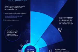 Prvih 10 zemalja zajedno je uložilo 561 milijardu dolara u energetsku tranziciju, što je gotovo tri četvrtine ukupnog svjetskog ulaganja. Na listi prednjači Kina koja je poveća svoja ukupna ulaganja u energetsku tranziciju za 60 posto u odnosu na razinu iz 2020., dodatno učvrstivši svoju poziciju globalnog lidera. Veliki dio ulaganja u Kini dolazi na elektrificirani promet, a također, kapaciteti od energije vjetra i sunca su povećani za 19 posto u 2021. godini.