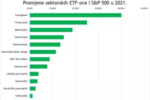 Upravo zato su u 2021. godini ulagači orijentirani na energetski, financijski, materijalni i industrijski sektor kojima pogoduju ovakvi uvjeti reflacije i bržeg rasta ekonomije. Dok je ukupno tržište, ako ga mjerimo ETF-om SPY koji prati kretanje 500 najvećih američkih kompanija, u 2021. godine poraslo oko 8 posto, energetske dionice, mjerene ETF-om XLE, vratile su investitorima čak 40 posto, financijske, mjerene ETF-om XLF, 25 posto, materijalne, mjerene ETF-om XLB, 19 posto, a industrijske, mjerene ETF-om XLI, 15 posto.