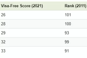 Poredak se temelji na bezviznom rezultatu određene države. Ocjena bez vize odnosi se na broj zemalja koje imatelj putovnice može posjetiti bez vize, s vizom po dolasku ili dobivanjem elektroničkog odobrenja za putovanje (ETA).
