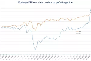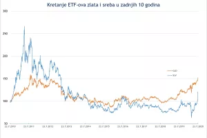 S obzirom na veću volatilnost cijene srebra, što je vidljivo na grafikonu usporedbe kretanja ETF-ova burzovnih kratica GLD (najpoznatiji ETF koji prati kretanje cijene zlata) i SLV (najpoznatiji ETF koji prati kretanje cijene srebra), ne iznenađuje brži rast cijene srebra u posljednjim tjednima.