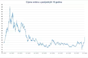 Vrijednost drugog važnog plemenitog metala, srebra, također hvata momentum u posljednjim danima. Cijena srebra, kao i zlata, posljednji put nalazila se na rekordnim razinama prije devet godina. Za razliku od zlata, cijena srebra se još uvijek nalazi 50-tak posto ispod svoje rekordne razine.