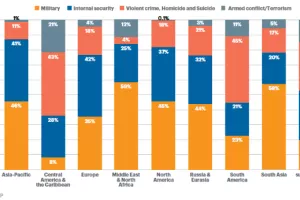 Vrste troškova nasilja razlikuju se od regije do regije, a najočitija razlika je u vojnim izdacima. Vojni izdaci predstavljaju 53 posto troškova naslja na Bliskom istoku i Sjevernoj Africi, a samo 8 posto u Srednjoj Americi i Karibima. Zanimljivo je da se Bliski Istok i Sjeverna Afrika odlikuju najnižim razinama nasilnog kriminala, ubojstava i samoubojstava, koji predstavljaju samo 4 posto ukupnog broja, u usporedbi sa 45 posto u Južnoj Americi. Europa prema ovoj ljestvici zauzima neku sredinu s 35 posto izdavanja vojsci i 42 posto izdvajanja za unutranju sigurnost.