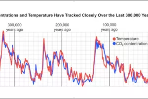 Ilustrativan primjer možemo vidjeti iz grafa koji prikazuje kretanje atmosferske koncentracije ugljičnog dioksida i temperatura na Antarktici kroz period od preko 300 tisuća godina. Koristeći ledene jezgre s Antarktike znanstvenici mogu izmjeriti koncentracije plinova u atmosferi iz daleke prošlosti. Antarktičke ledene jezgre sadrže različite slojeve snijega akumulirane kroz tisuće godina. Pomoću zraka zarobljenog između slojeva znanstvenici mjere povijesne koncentracije plinova u atmosferi.