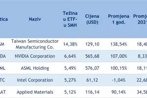Investitori koji ne žele birati između pojedinih dionica koji dolaze iz ove propulzivne industrije mogu se usmjeriti na VanEck Vectors Semiconductor ETF (burzovna kratica SMH) koji prati kretanje izabranih kompanija s fokusom na ranije spomenute. U skladu sa izvedbom sastavnica koje ETF pokriva, cijena udjela je skočila 74% u posljednjih godinu dana. Tablicu sa popisom pet najvećih pozicija i težinom njihove zastupljenosti donosimo u nastavku.