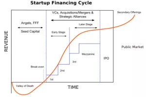 Ovisno u kojoj ste fazi, odnosno koliko dugo poslujete i kakav prihod ostvarujete, ispod je prikazan ciklus financiranja startupova. Većina startupova nažalost ne uspije u samom početku (vidi graf Valley of Death), a najčešći razlozi su što se tim raspadne, tržište ne traži vaš proizvod ili se ne dobije financiranje.