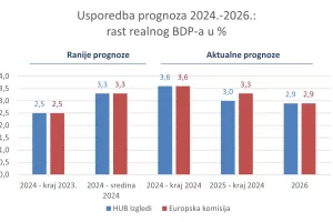 Trenutačna očekivanja EK i glavnih ekonomista (koje prikazujemo kao prosjek, tzv. HUB konsenzus) o rastu BDP-a nalaze se na 3,6 posto za 2024., a HNB očekuje 3,7 posto. To je očigledno ubrzanje u odnosu na 3,3 posto koliko je ostvareno 2023. godine. Hrvatska nastavlja rasti brže od EU i europodručja u cjelini, čije stope rasta za 2024. godinu Komisija procjenjuje na 0,9 posto odnosno 0,8 posto. Zbog velike razlike u tempu rasta logično je očekivati i nešto veću stopu inflacije. Glavni ekonomisti ju za Hrvatsku procjenjuju na 3 posto (prosjek na prosjek godine) za Hrvatsku. No, godina je na izmaku, a očekivanja drugih makroekonomskih veličina približno su u skladu s ranije objavljenim Vladinim prognozama i prognozama Europske komisije. Zbog toga je puno zanimljivije promotriti prognoze za 2025. i 2026. godinu.