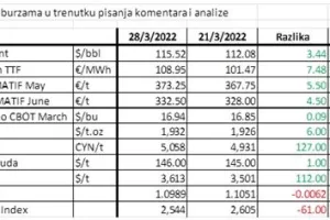 U energetskom sektoru, glavna vijest proteklog tjedna bila je ruska najava da će sve neprijateljske zemlje naftu i plin morati plaćati u rubljima. Trafigura i Gunvor, dva najveća nezavisna trgovca naftom u svijetu, navode nedostatak dizela u Europi. Rusija je bila veliki dobavljač dizela za Europu, i do 15 posto potreba. Posljedica toga najjednostavnije se vidi na benzinskim pumpama, gdje je cijena dizela veća od cijene benzina i to ne za malo. Inače, cijena nafte se kreće u rasponu od 115 do 120 $/bbl zadnjih nekoliko dana, u očekivanju manje potražnje Kine zbog rasta broja slučajeva oboljelih od korone i planiranog lockdowna. Cijene plina također su bile pod pritiskom i pale su ispod razine od 100 €/MWh, ali su se nakon toga vratile na trenutnu razinu. SAD i EU su postigle dogovor o isporuci LNG-a što bi trebalo malo smanjiti ovisnost o ruskom plinu. Ipak, nemoguće je u potpunosti supstituirati ruski plin, makar u kratkom roku.