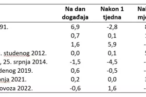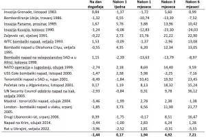 Povijesno gledano, u proteklih 40 godina europski indeksi (reprezentativna vrijednost - DAX Indeks u Frankfurtu) pokazali su kratkoročni pad cijena na datume raznih geopolitičkih događaja (ratovi, vojne operacije, teroristički akti i slično). Istodobno, unutar mjesec dana od početka geopolitičkog događaja, u većini slučajeva indeksi su se oporavili i počeli rasti iznad starih vrijednosti (uključujući napade 11. rujna, terorističke napade u Londonu i Madridu te vojne sukobe u Ukrajini).