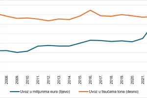 Da bi se neutralizirao učinak rasta cijena, uz nominalni uvoz analiziran je realni uvoz kave. Dobiveni rezultati prikazani su na slici 3. Pritom je nominalni uvoz kave mjeren na lijevoj osi slike 3. i izražen je u milijunima eura, dok je realni uvoz kave mjeren na desnoj osi i izražen je u tisućama tona.