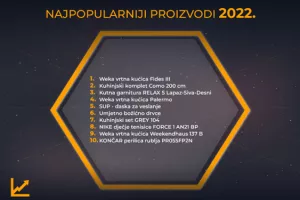 I na listi najpopularnijih proizvoda u 2022. naišli smo na nekoliko iznenađenja. Na prvom mjestu našla se vrtna kućica Fides brenda Weka, čija su se čak tri različita modela našla na listi ovogodišnjih najpopularnijih proizvoda. Tu su i dvije blok kuhinje – komplet Como i set Grey te sjedeća garnitura Relax S.