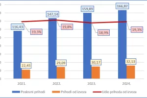 Udio izvoza u poslovnim prihodima kod velikih u 2024. iznosio je 21.1 posto, srednje velikih 23.1 posto, malih 19 posto i mikro 11.8 posto. Promatrao u 4-godišnjem razdoblju, prihodi od izvoza velikih su prosječno godišnje rasli 13.1 posto. Kod njih je jedino zabilježen prosječni godišnji rast udjela izvoza u poslovnim prihodima (2.0%). U ostala 3 segmenta, prihodi su prosječno godišnje rasli u rasponu od 7.5 posto (srednji) do 5.7 posto malih i 4.4 posto mikro, dok je udio izvoza u poslovnim prihodima prosječno godišnje padao (kod srednjih za 1.9%, malih 2.8%, a mikro 1,0%)