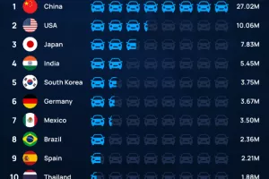 Prema podacima koje je objavila Međunarodna organizacija proizvođača motornih vozila (OICA), već 13. godinu zaredom Kina dominira globalnom proizvodnjom motornih vozila, proizvevši više od 27 milijuna automobila i gospodarskih vozila. Nakon nje nalaze se Sjedinjene Američke Države čije su kompanije prošle godine proizvele nešto više od deset milijuna vozila, dok je na trećem mjestu Japan s proizvedenih 7,83 milijuna vozila.