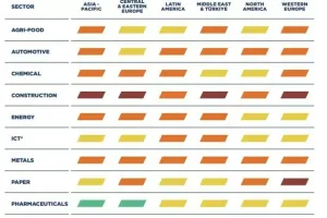 Što se tiče rizika među gospodarskim sektorima, u Srednjoj i Istočnoj Europi najveći rizik imaju građevinarstvo, tehkstilna industrija, transport i drvna industrija. Visok je rizik i pred kemijskom, metalnom i industrijom papira te energetikom, dok poljoprivreda, prehrambena i automobilska industrija, ICT te maloprodaja imaju srednji rizik. Jedino sektor farmaceutskih proizvoda ima nizak rizik od ekonomskih šokova.