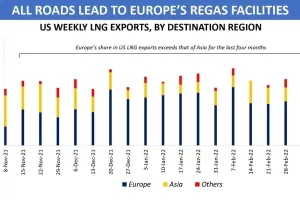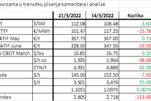 Cijena nafte u jednom trenutku prošli tjedan je pala ispod 100 $/bbl, da bi nakon toga skočila na trenutnu razinu. Iako je na razini tjedna, cijena nafte pala 4 posto, zadnja tri dana cijena raste budući da rat u Ukrajini ne jenjava, a vodeći proizvođači imaju poteškoća da ostvare alocirane kvote prema ugovorima. OPEC+ članice su promašile ciljanu proizvodnju za više od 1 mil barela/dan u veljači što vraća u fokus investitora pitanje može li tržište uopće zamijeniti rusku naftu? Cijena plina je u padu uslijed novih vijesti o povećanju LNG isporuka i ugovora prema Europi, kao i zbog činjenice da za sada Gazprom isporučuje sav ugovoreni plin prema Europi. Ipak, pad cijene je limitiran potencijalnim rizikom od rasta cijene ako se EU priključi SAD-u u nametanju sankcija na izvoz nafte i plina.