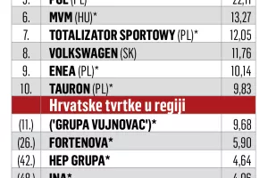 Najveći sustav, Fortenova grupa, s 5,9 milijardi eura prihoda zauzeo bi 26. poziciju, HEP grupa bila bi 42., konsolidirana Ina 48., a zbrojene konsolidacije ENNA grupe i Blue Horizona (tvrtke grupirane oko PPD-a) skočile bi na 55. poziciju… A kad bi se promatrao stvarni portfelj Pavla Vujnovca, koji je većinski vlasnik Fortenove, ENNA grupe i Blue Horizona, riječ je o kompanijama koje su prošle godine ostvarile 9,67 milijardi eura prihoda, čime bi ta grupacija skočila do praga top 10 – na jedanaestu poziciju u regiji.