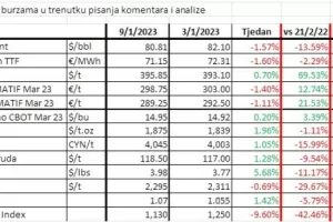Gledajući promjenu cijene nafte na razini godine, čovjek se zapita kakva kriza energenata, kakva inflacija? Drugi tjedan u godini započinjemo s rastom cijene nafte, na razini oko 81 $/bbl (što je svega par posto više nego što je bila na početku prošle godine). Trenutna cijena rezultat je povećane nade u rast potražnje Kine te nadanja da će FED ublažiti svoj agresivan pristup zaoštravanja monetarne politike.