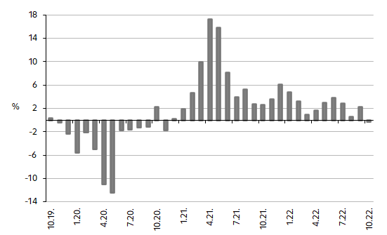 Ukupna sezonski i kalendarski prilagođena industrijska proizvodnja u listopadu je u usporedbi s rujnom bila niža za 1,4 posto što je pridonijelo negativnoj stopi rasta na godišnjoj razini. Kalendarski prilagođen obujam industrijske proizvodnje bio je u listopadu za 0,3 posto niži u odnosu na listopad 2021. Tako je prekinut pozitivan trend godišnjih stopa rasta koji je trajao kontinuirano od prosinca 2020. Posljedično, prosječna kumulativna godišnja stopa rasta obujma industrijske proizvodnje u razdoblju od siječnja-listopada usporila je na 2,3 posto.
