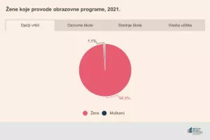 Što se pak tiče žena koje provode obrazovne programe, zanimljivo je primijetiti da njihov udio opada sa stupnjem odgoja i obrazovanja institucije u kojoj su zaposlene. Naime, najzastupljenije su na najnižoj razini obrazovanja, dok je njihov udio najmanji među nastavnicima i suradnicima u nastavi na visokom učilištima.