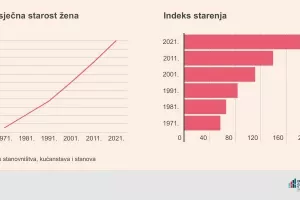 Osim što se rađa sve manje djece, zamjetan je i trend starenja cjelokupnog stanovništva. Ako promatramo prosječnu dob žena, ona se u posljednjih 50 godina povećala za čak 10,5 godina, odnosno s 35,5 godina, koliko je iznosila u 1971., na 46,0 godina u 2021. To možda najslikovitije pokazuje indeks starenja, indikator koji označuje postotni udio osoba u dobi od 60 i više godina u odnosu na stanovništvo mlađe od 20 godina. Kao što je vidljivo na grafikonu, na prijelazu stoljeća prešla se granična vrijednost od 100, koja upućuje na to da na svaku ženu starije dobi dolazi jedna žena mlađe dobi. Točnije, u posljednjih trideset godina 20. stoljeća udio žena u dobi od 60 i više godina bio je manji u odnosu na one mlađe od 20 godina, a od 2001. na ovamo povećava se udio žena u dobi od 60 i više godina.