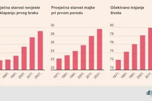 Isti trend primjećujemo i kod podataka o prosječnoj starosti nevjeste pri sklapanju prvog braka te prosječnoj starosti majke pri prvom porodu koje se obje s godinama također povećavaju. Naime, žene sve kasnije stupaju u brak i ta dob se u promatranome pedesetogodišnjem razdoblju povećala za čak 6,9 godina, a slično je i ako promatramo starost majke pri prvom porodu. Žene su u 1971. u prosjeku rađale s 22,6 godina, da bi se ta dob do 2021. pomaknula na čak 29,6 godina. Ono što je pozitivno jest to da se tijekom desetljeća kvaliteta života općenito poboljšala, a razvoj znanosti i tehnologije pogodovao je ranoj dijagnostici i prevenciji bolesti, stoga se očekivano trajanje života znatno produljilo. U odnosu na 1971., kada je očekivano trajanje života za žene iznosilo 72,3 godine, u 2021. je doseglo čak 79,6 godina.