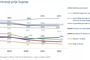Uloga platformi za usporedbu cijena postala je još relevantnija u fazi istraživanja prije kupnje. Čak 41 % ispitanika istražuje online pretraživanjem, a 15 % je izričito potvrdilo da prije kupnje istražuju na platformama za usporedbu cijena.