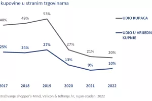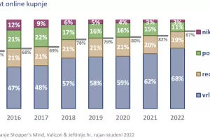 Prema rezultatima ovogodišnjeg istraživanja trend online kupnje ponovno je porastao s gotovo 68 posto ispitanika koji u web trgovinama kupuju barem jednom mjesečno. Među online kupcima najviše je pripadnika generacije X, odnosno onih starijih od 45 godina, a najčešće se kupuju odjeća, obuća i modni dodaci. Porastao je i prosječan iznos kupnje koji sada iznosi 628 kn.