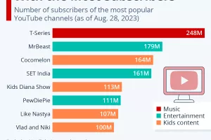 Indijski bollywoodski glazbeni kanal T-Series trenutno je kanal s najviše sljedbenika na YouTubeu (234 milijuna), i nalazi se ispred MrBeast (179 milijuna) i kanala koji radi sadržaj za djecu Cocomelon (164 milijuna). U 2018. T-Series je bio uključen u žestoku bitku za prvo mjesto na YouTubeu sa zabavnim kanalom PewDiePie (111 milijuna pratitelja). Međutim od tada je Šveđanin Felix Kjellberg, PewDiePie usporio sa sadržajem pa se sada nalazi na šestom mjestu iza kolega youtubera. Prije 2018., PewDiePie je pet godina bio račun s najviše pretplatnika na YouTubeu, no slika se danas ipak promijenila.