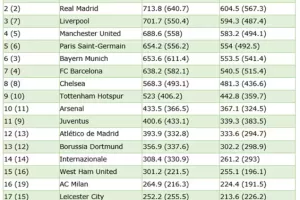 Vodeći globalni pružatelj usluga savjetovanja i revizije, kompanija Deloitte, objavila je listu top 20 najbogatijih klubova na svijetu, a po prvi put, više od polovine uključenih klubova dolazi iz engleske Premier lige. Čelno mjesto, kao i lani, drži aktualni prvak Manchester City s prijavljenim prihodima od 731 milijun eura, dok je Real Madrid na drugom mjestu s 713,8 milijuna eura prihoda. Španjolski klub prati Liverpool koji se s lanjskog sedmog popeo na treće mjesto i za sezonu 2021/22 prijavio prihode u visini od 701,7 milijun eura. Ovo je prvi put u 27 godina da je po zaradi prestigao četvrtoplasirani Manchester United te se može pohvaliti da je jedan od pet klubova koji su na utakmicama zaradili preko sto milijuna eura.