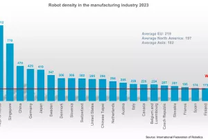 Usvajanje robota u tvornicama diljem svijeta nastavlja se velikom brzinom a nova globalna prosječna gustoća robota dosegla je rekordnih 162 jedinice na deset tisuća zaposlenika u 2023., što je više nego dvostruko u odnosu na broj izmjeren prije samo sedam godina kada su bile 74 jedinice na 10 tisuća zaposlenika, pokazuje izvješće World Robotics 2024, koje je predstavila IFR.