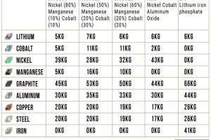 Evo kako se sadržaj minerala razlikuje za različite kemijske vrste baterija s kapacitetom od 60 kWh