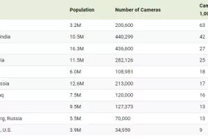 Možda neočekivano, ali prva četiri grada su u Indiji, koja je druga najveća zemlja na svijetu po broju stanovnika pa nadzorne kamere očito igraju važnu ulogu u naporima zemlje da smanji zločine.